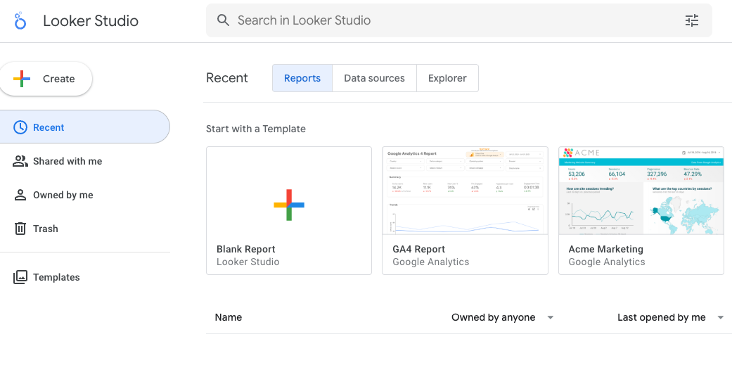 Para los profesionales del marketing que ya trabajan en el ecosistema de Google, Looker Studio es un punto de partida obvio. Se conecta de forma nativa a Google Analytics 4, Google Ads, Google Search Console, BigQuery y Google Sheets, lo que significa que puedes reunir todos los datos de tus canales de Google en un único informe sin necesidad de conectores de terceros. El generador de informes de arrastrar y soltar es lo suficientemente intuitivo para los usuarios sin conocimientos técnicos, y la galería de plantillas te ofrece una sólida ventaja inicial para los casos de uso de informes más comunes.