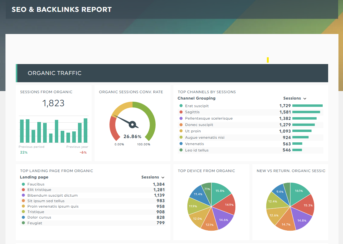 Con nuestra integración con Google Analyticsobtendrá rápidamente sus datos de Google Analytics de la herramienta en un informe con un formato atractivo en cuestión de minutos. sin tener que abrumar a sus lectores con métricas y datos irrelevantes.
